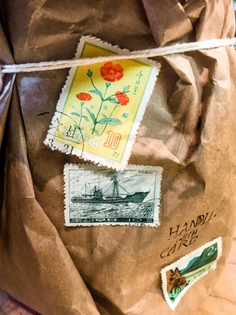 While the lover back home waited eagerly for their love's return, the package began to sprout and grow into a garden of anticipation and longing that could not be contained and has broken free of its brown paper packing. This lovely springtime mix, reminiscent of conversation hearts, has purple and yellow erupting from its packing—bound with twine and littered with stamps from its many stops and side journeys along the way—tells the story of anticipated love and longing and the joy of hope finally requited.