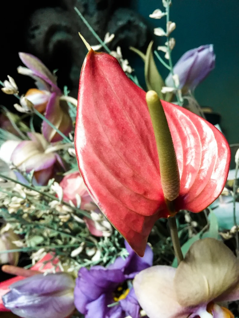 Olivia, a sucker for shiny plastic! To Olivia the very nature of Valentine's Day is tacky, and she sought to embrace it. Her design began with Anthurium, because of it looks like a shiny pink plastic heart.
