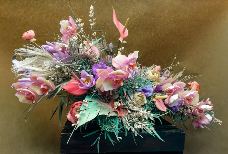 "Are you kidding?!" she said, "that is exactly what I am going for!" Synthetic is her inspiration! While adding a big green leaf into her piece she paused. Then she said, "Nah, looks way too natural" and painted it pastel, and cut it up to mimic another, much larger leaf. Taking a classic flower arrangement shape, the "Hogarth's curve", she played around with locally grown orchids, anthurium, ranunculus, and tulips within a pastel palette.