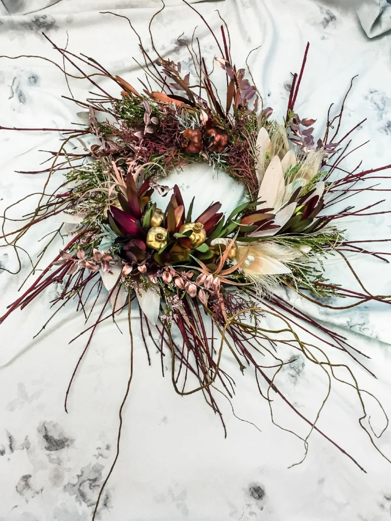 I began by harvesting the twigs myself from our farm and bundling and binding them to form a wreath and then I began to play. Choosing elements that reminded me of the love of family, a close friend, or a neighbor, I used heather, a super fluffy green with tiny flowers that makes a hillside look like the fluffiest giant bed.