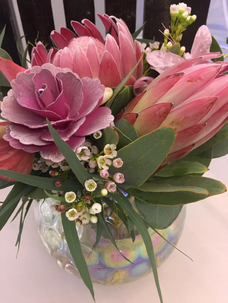 Bursting full of buttons, butterflies, and wooden roses coupled with protea, waxflower and collections of eucalyptus greens—all in a container that looks like a bubble that'll bring you right back to summer days as a kid running through the grass barefoot.